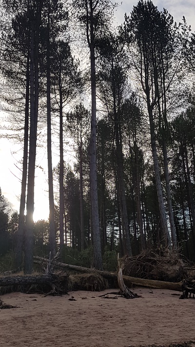 Then on our right, where the view would have been, a monstrous hill seemed to rise sheer from a deep valley we knew wasn’t on the map. But no, it was surely a bank of darker cloud – there are no hills that high here. It faded in and out of sight, until the penny dropped – it was the start of the trees in the midst of which the Obelisk stands. But so tall! And so far away, across a great canyon of a valley. “Not going there,” we said, as the track ended abruptly and we ignored ourselves to head south towards the top of Craig Gibbon. I don’t know how mist and cloud so trick the eye, but the great gulf was actually just a slight dip in the terrain, and the supernaturally gigantic trees were but mature pines and larches clustered on top of the little summit.