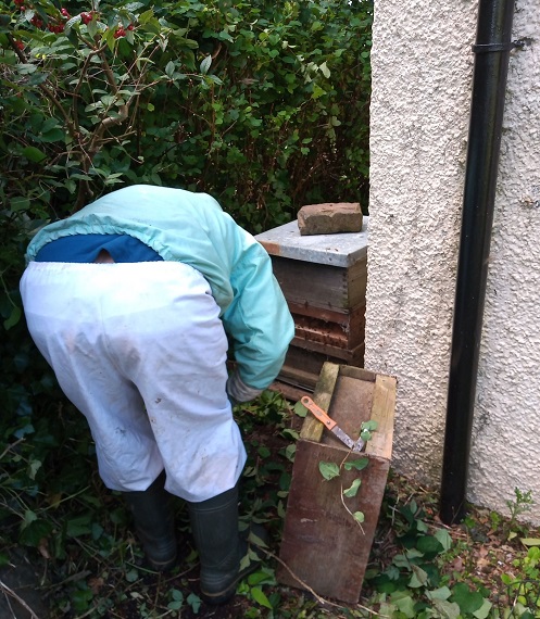 First, let me make it understood: the narrow path at the back between our house and an unruly hedge of ghastly snowberries and virulent ivy is a no-go area we rarely check up on till the ivy taps on the one narrow window in that wall. This is how the bee boxes went un-noticed.