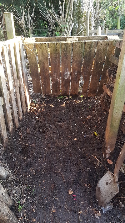 The last few shovelfuls, the final pitchfork-loads, and lo! I discover that the sticks I placed at the base of bay 1 last autumn because in a whole year they had failed to become compost are still there, barely altered….. I spread them across the base, along with the 3 year old thick cardboard tubes from inside the new polytunnel cover… they ARE biodegradeable, and I WILL win this battle….one day! On the plus side, after years of running a nursery here when thanks to lack of time and the vagaries of some of our volunteers, my compost heaps produced more plastic than a supermarket, this year my accidental plastic input and retrieval is minimal – and I can re-use the two ties and labels. And only one unreconstructed plastic-reinforced tea bag, right at the bottom, since we have found plastic-free brands.